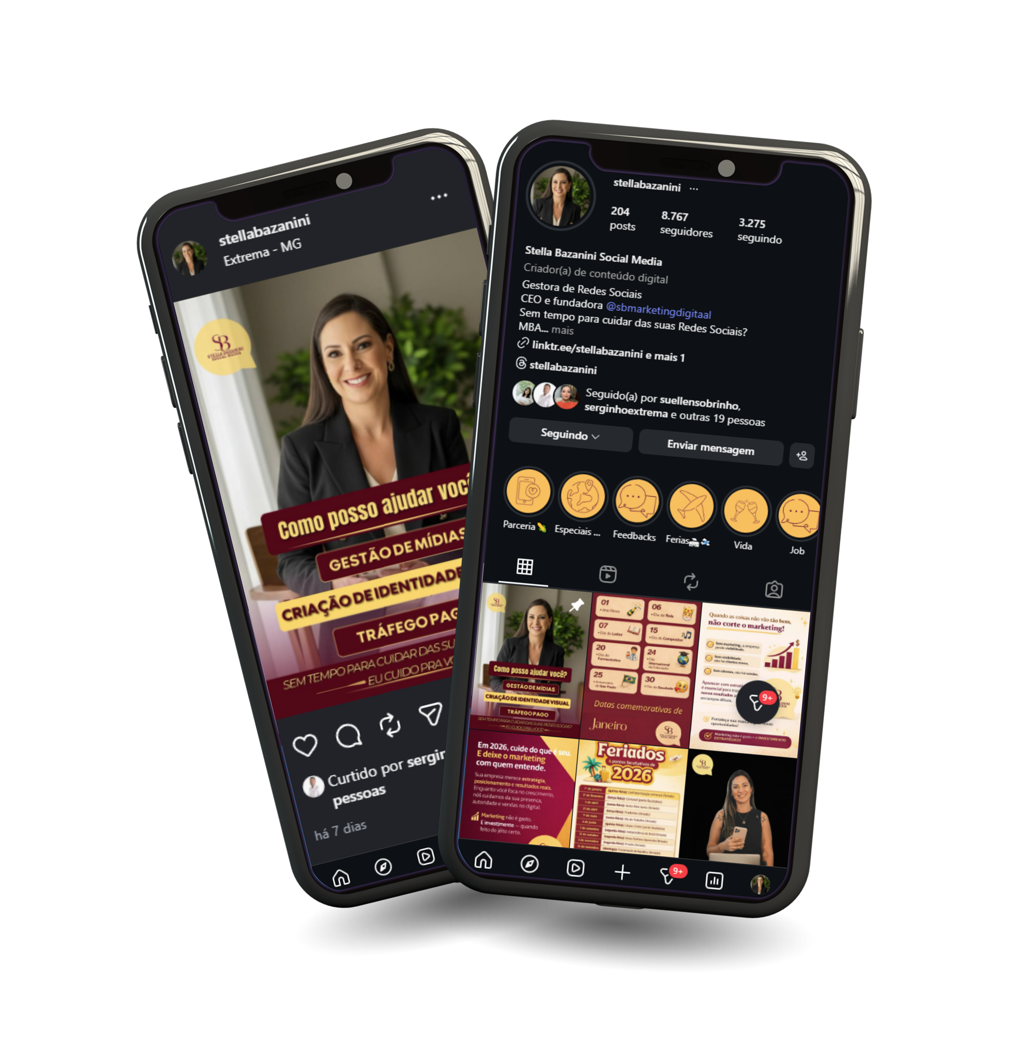 Planejamento de conteúdo, calendário editorial, criação de posts, stories e reels, legendas estratégicas, copywriting, interação com seguidores e relatórios de desempenho.